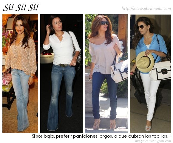 Veamos algunos ejemplos donde te mostramos como la actriz Eva Longoria que tiene una baja estatura -1.57 metros- luce realmente pequeña al utilizar pantalones tipo capri, o bien pantalones con los ruedos doblados.