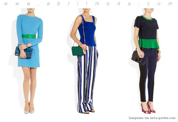 Otra opción un poco más «arriesgada» y muy a la moda, es combinar este tono verde Esmeralda con diferentes tonos de azul… Las opciones son muchas, desde llevarlo con tonos más celestes como el del primer ejemplo -para resultados más juveniles y algo «juguetones»-; hasta combinarlo con tonos azules oscuros para composiciones más «clásicas».