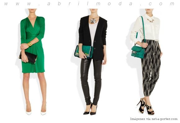 La opción más «segura» es combinarlo con tonos neutros…  En el primer ejemplo del vestido en este tono Esmeralda, vemos cómo un bolso en negro y unos zapatos en blanco lucen muy bien con este color, y le agregan mucha sofisticación al conjunto; mientras que en los otros dos ejemplos con la ropa en tonos neutros, este verde Esmeralda en un bolso -o podría ser en los zapatos- agrega un «toque» de color que más bien realza estos atuendos monocromáticos.