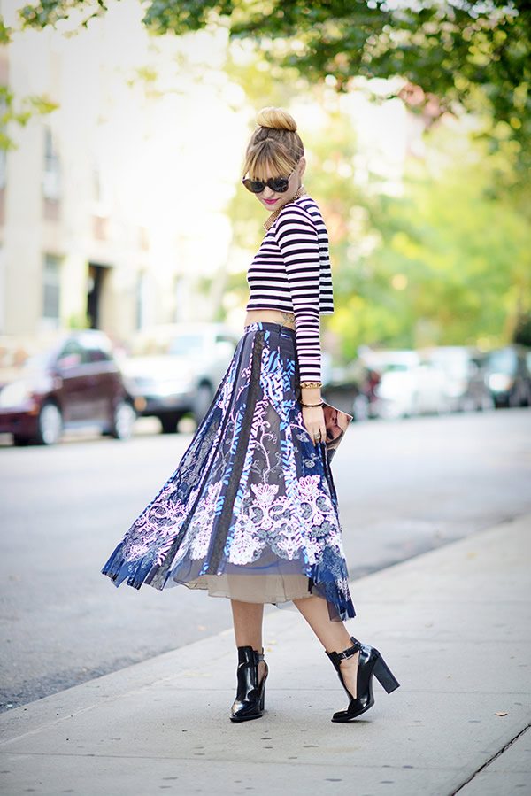 Estos tres ejemplos que te mostramos son muy femeninos – según el orden por el estampado, las sandalias, o el top corto-, pero en realidad una falda «midi» también podría combinarse con por ejemplo con una camiseta, para un estilo más ecléctico.