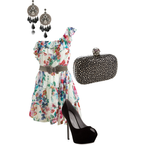 En el caso del look para la noche con vestido de flores elevamos un poco el nivel cambiando el bolso grande por uno de mano muy decorado, unos aretes largos, un cinturón llamativo, y unos zapatos de tacón alto.