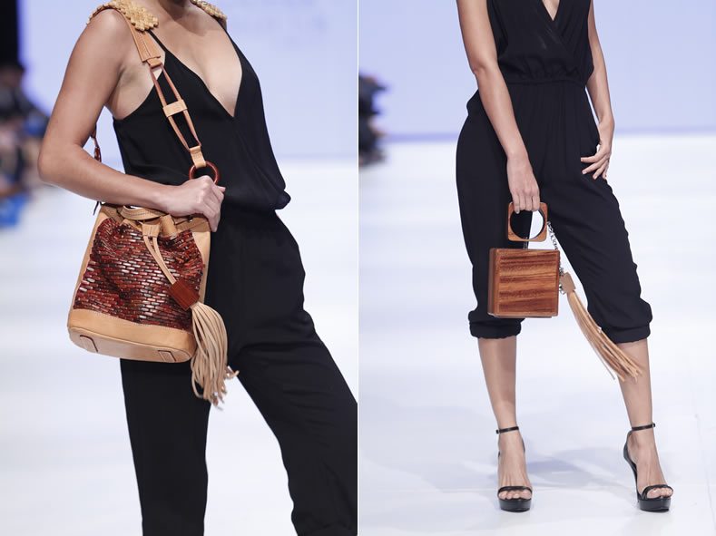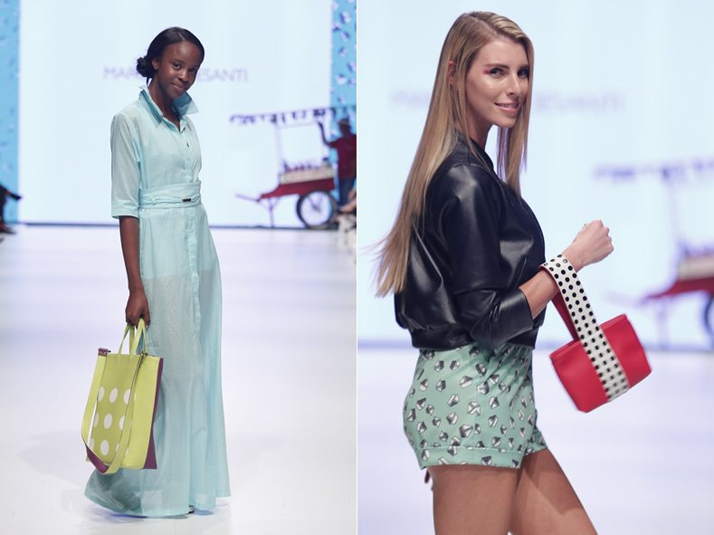 Los bolsos de líneas sencillas con estampados de lunares, ondas, y espirales en colores llamativos complementaron totalmente la colección alegre y ecléctica que presentó la diseñadora costarricense.