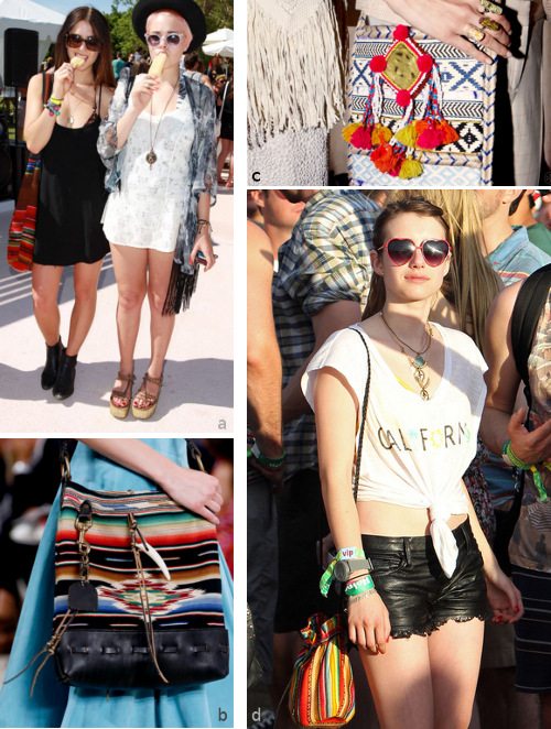 Los bolsos étnicos también son especiales para llevar en estilos eclécticos como los usados para festivales de música -ejemplos a y d de la imagen de abajo-, donde como verás pueden acompañar desde un atuendo de vestido con botas en negro, hasta un look de camiseta con «short» de cuero… En realidad se pueden llevar «con todo» y permiten crear combinaciones fuera de lo común, o con un «aire» bohemio muy marcado.