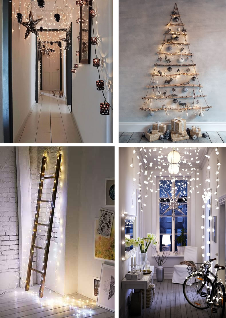 Dentro de lo que encontré amo la idea de colocar luces cayendo desde el cielorraso, me parece ideal para crear ambientes acogedores y con algo de magia. También para los que no hacen árbol de navidad la opción de crear una silueta de árbol iluminada en la pared me parece muy linda, y para los más vanguardistas una escalera iluminada es una muy buena opción de utilizar las luces de navidad en algo no tan esperado.