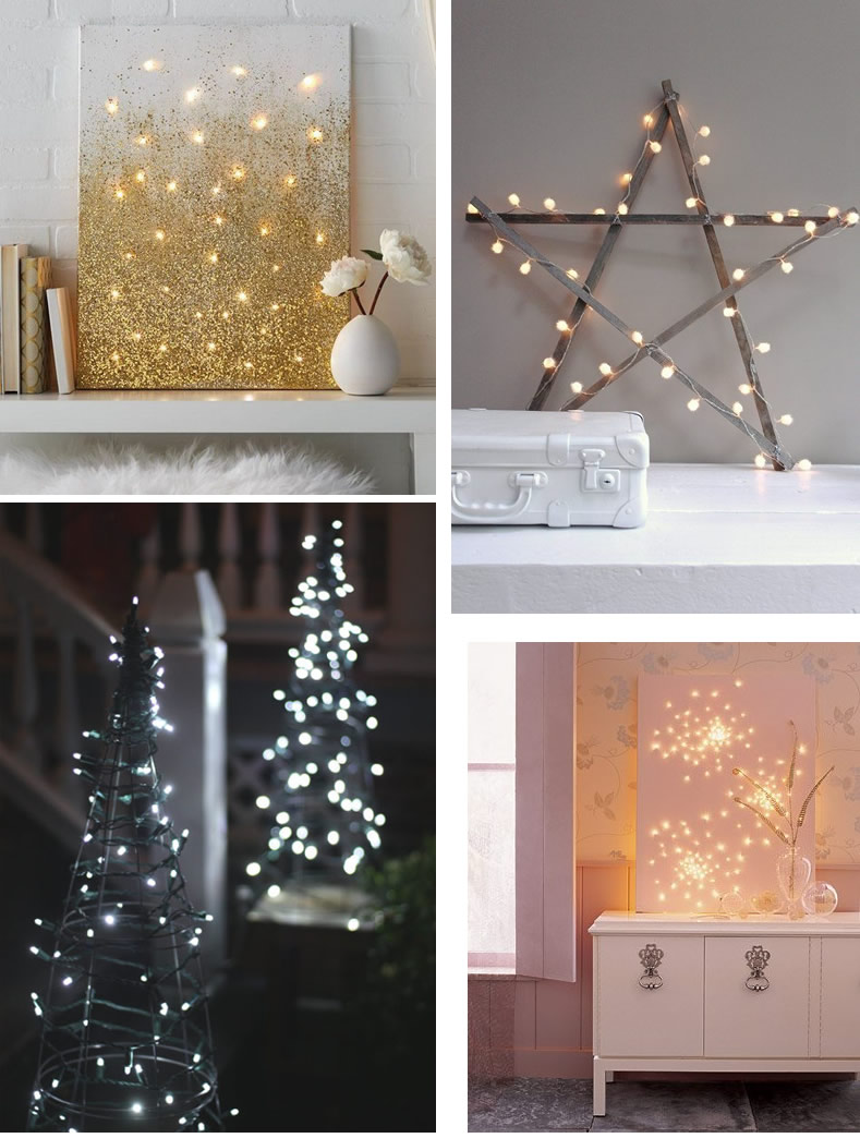 De estas mi favorita es la idea de poner luces que salgan en un lienzo! Como verás en la imagen de abajo podés hacerlo muy elaborado agregando además escarcha o purpurina dorada, o solo con las luces, ambas son lindas.
