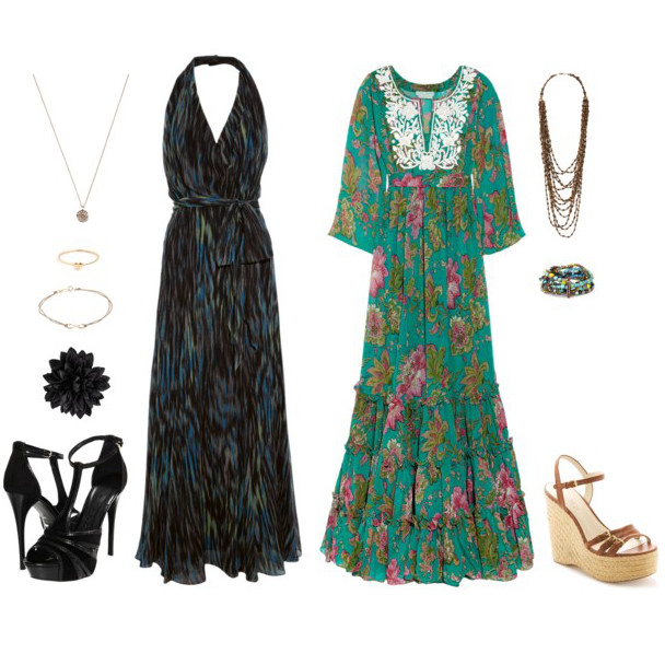 Los maxivestidos fueron prendas también muy populares en los años setentas, y se llevaron de muchas maneras diferentes, a continuación te damos dos propuestas un tanto opuestas. La primera para un estilo muy sofisticado con un maxivestido de cuello halter acompañado de unas sandalias de tiras, unas joyas sencillas y una flor para el cabello -muy típico de la época-, mientras que la otra es para un estilo más relajado con un «aire» hippie– campestre que se logra gracias al estampado floral, los vuelos, y al llevarlo con sandalias de plataforma con fibras naturales.