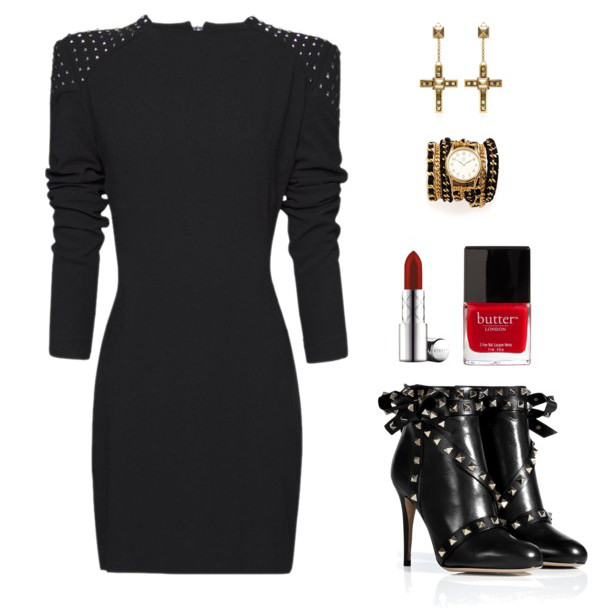 Las «hombreras» son sin lugar a duda una moda clave de los 80’s que muchos odian, pero que igual a muchos nos gusta… Este último look está basado en un vestido corto con «hombreras» y «tachas» o decoraciones en esta zona, que unido a su corte sencillo y color negro es perfecto para crear un estilo rockero a partir de él; no se requiere mucho más que unos botines también decorados, unos brazaletes muy llamativos, unos aretes en cruz, y pintura de labios y uñas en rojo.