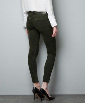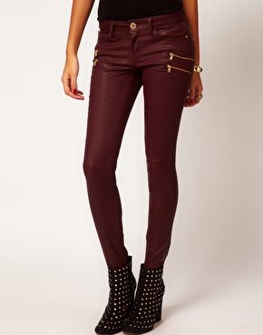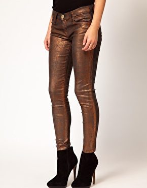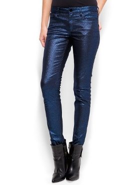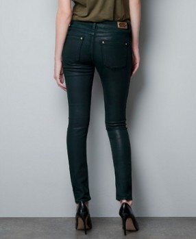 Junto con los colores predominantemente oscuros otras de las características que muchas veces acompañan a los jeans de colores para fin de año, son los efectos metálicos y «encerados» o «mojados», que dicho sea de paso los hace piezas ideales para los looks más festivos de la época. A continuación te muestro algunos ejemplos de lo que en este momento están ofreciendo las tiendas Mango, Asos y Zara.