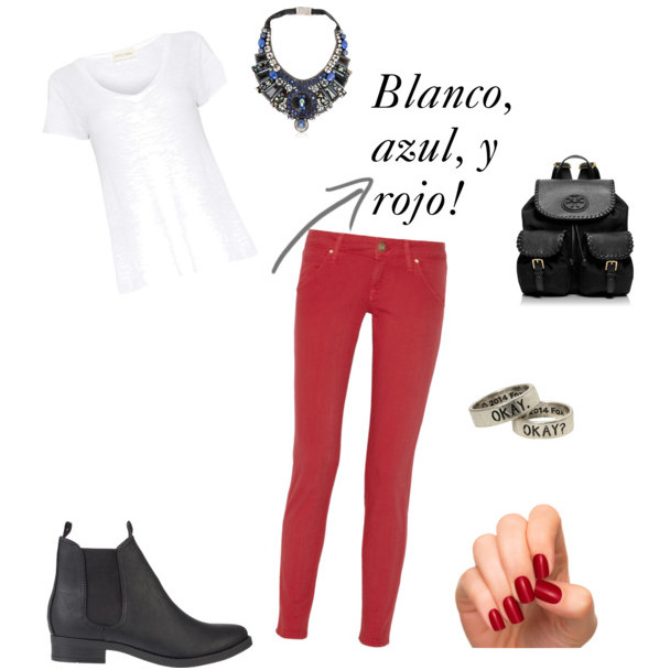 Una camiseta blanca, un pantalón rojo, y un lindo collar con azul es la propuesta que te damos, que podés completar con unos botines planos, una mochila o bolso sencillo -ambos en negro para no sobrecargar de colores el look-, unos anillos sencillos, y unas uñas en rojo.