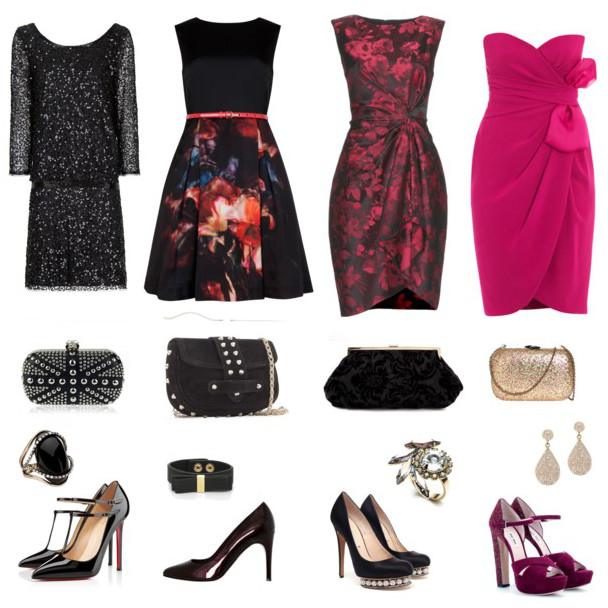 Una vez más el color negro, el brillo, las telas de apariencia delicada, y los colores brillantes son muy buenas opciones para estos looks festivos; además de los zapatos de tacón alto y los bolsos tipo sobre o clutch.