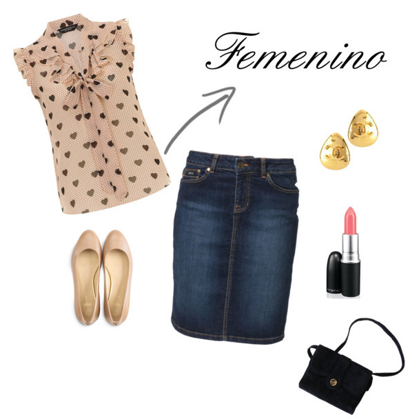 Otra opción que te proponemos apta para el día a día, es utilizar una falda de mezclilla en un largo por la rodilla -más o menos- para que no sea muy corta e incómoda dependiendo del tipo de actividad que realicés ¿Cuál es la «clave» en este look? La blusa con volantes -o vuelos- en un estampado con corazones -que podría ser un estampado floral o en un lindo color llamativo- que aporta el «aire» femenino que buscamos… Unos aretes, bolso y zapatos nude -o piel- son complementos perfectos.