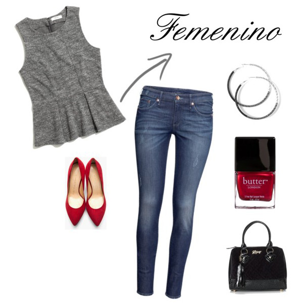 Por último, te proponemos un look femenino con jeans que debe su feminidad al «corte» tipo peplum de la blusa que da énfasis a la cintura, y al uso de color en zapatos y uñas… Este puede resultar ideal para una salida en la noche, o una salida a tomar café con las amigas.