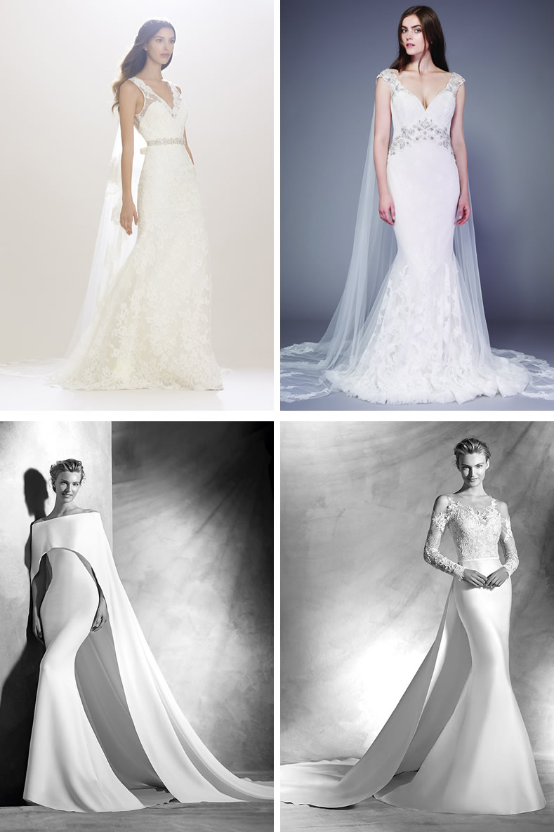 Por último para las que quieren lucir como novias pero con algo que las diferencie, está el uso de colas o capas llamativas. ¿Y a qué me refiero con llamativas? Cuando elementos que se salen de la normalidad como las colas que salen a nivel de los hombros -o de la cintura pero como elementos extra-, así como las capas que pueden cubrir parte de los hombros como en el diseño de la imagen de Pronovias.
