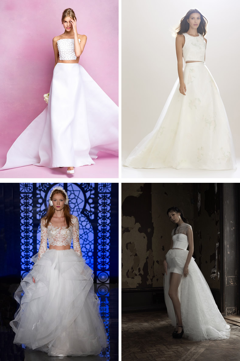 Un estilo sumamente novedoso ideal para aquellas que se van a casar en la playa o en una zona cálida es el uso de dos piezas -top y falda-… Esta tendencia es muy moderna y actual y es una transformación de lo que llevamos tiempo de ver en las pasarelas de ready-to-wear.