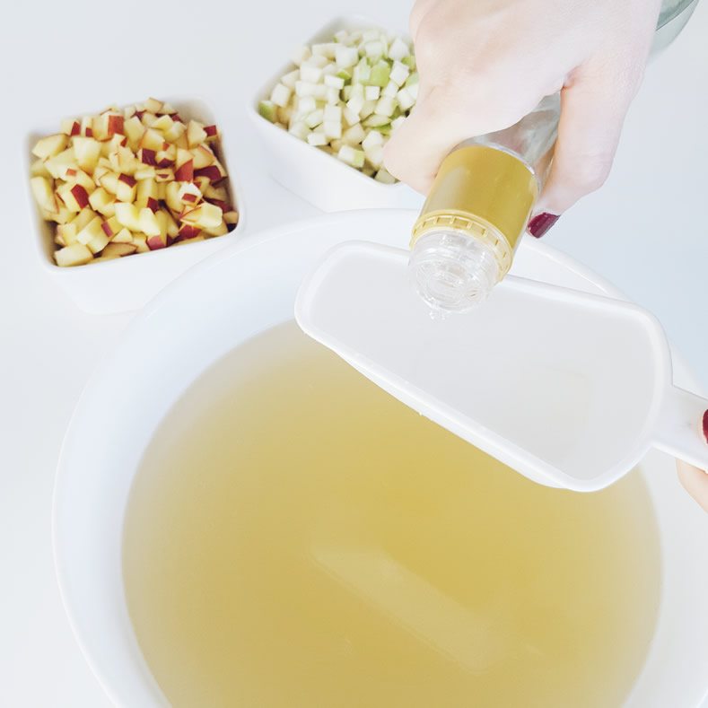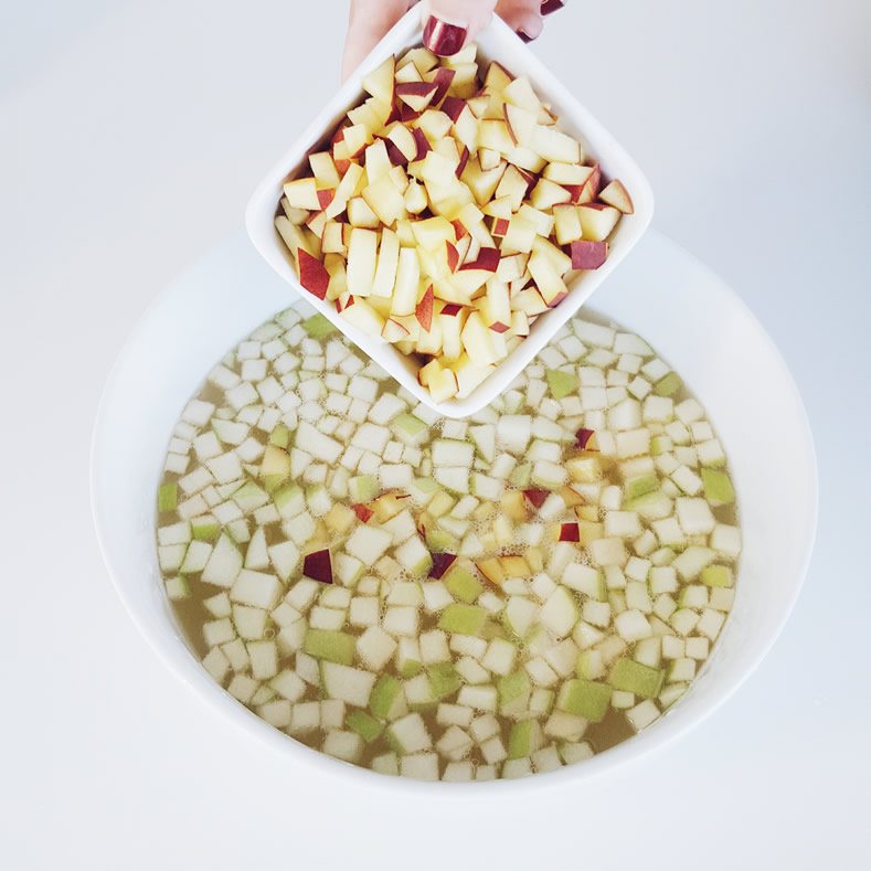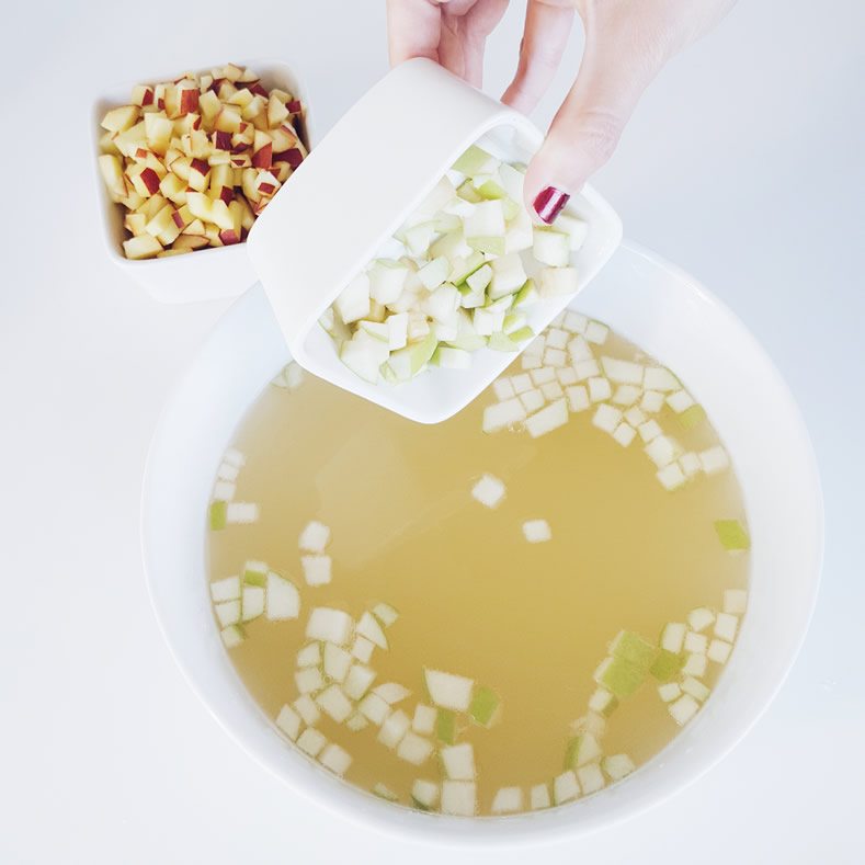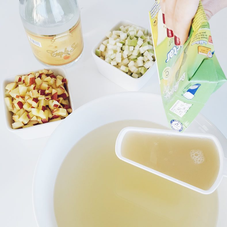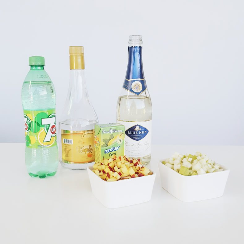 ¡Es muy fácil! Lo primero es cortar la fruta, yo decidí cortarla en cubos pequeños por los recipientes en que la iba a servir, pero puede ser más grande. Luego, se combinan los líquidos en un bowl o jarra grande, y por último se añade la fruta.