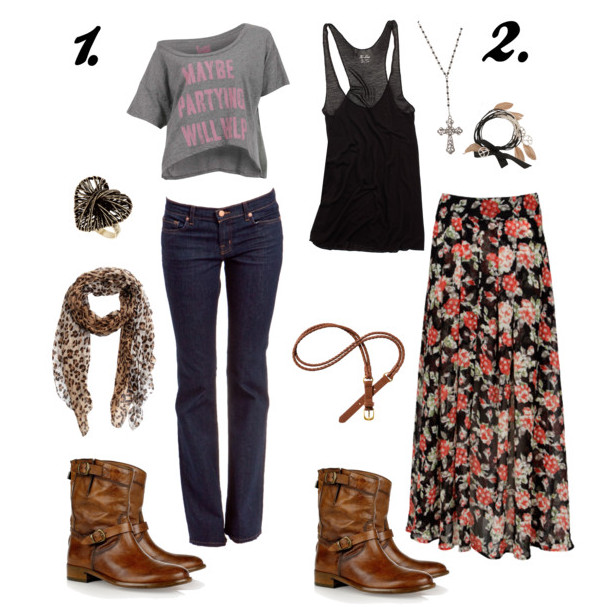 En la primera opción te proponemos llevarlas con una camiseta y para agregarle algo más interesante al conjunto, añadir un fular en un estampado llamativo, en la segunda propuesta que tiene un estilo bohemio, una linda maxi-falda con estampado floral, un cinturón, algunos accesorios con plumas y listo!