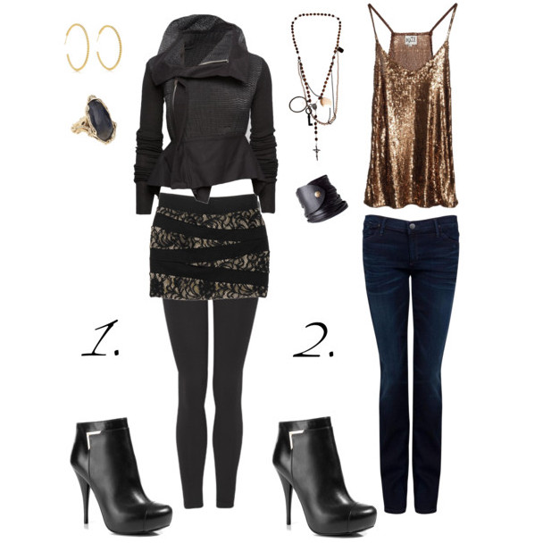 Estas otras propuestas están pensadas para la noche… Una salida especial como una cita, o una salida con las amigas. En la primera opción proponemos usar los botines con una falda corta, medias oscuras, una chaqueta, y algunos accesorios, y en la segunda opción le agregamos glamour al outfit de jeans al complementarlo una linda blusa con lentejuelas o algo de brillo.