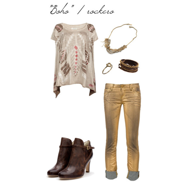 Como primera propuesta -que además nos parece una de las más atrevidas ya que no es tan común verla por la calle- te traemos un outfit «armado» a partir de unos jeans en color dorado, que para esta ocasión acompañamos de una camiseta con estampado tribal y botines y accesorios con un aire boho ; también podría combinarse con una blusa en negro, para darle un «toque» mas rockero.