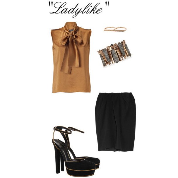 En la propuesta dos te mostramos la opción de un look muy femenino y sofisticado a la vez, construido a partir de una falda lápiz y una blusa con un lazo que se anuda en el cuello; además de unas sandalias de plataforma con detalles también en dorado.