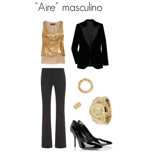 Por ultimo, otra muy buena opción en donde incluir el color dorado es acompañando un traje de pantalón y saco -blazer- con «aire» mas bien masculino, para hacerlo más llamativo e incluso agregar un «toque» sexy muy sutil.
