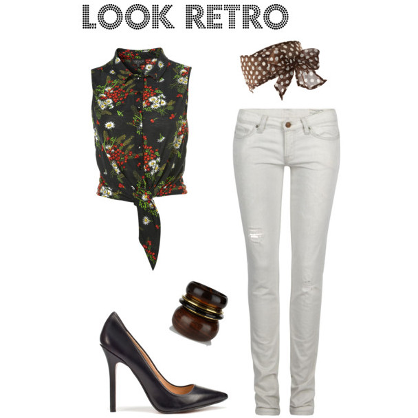 En la primera opción acompañan unos skinny jeans  -tubo o pitillo- con una blusa anudada a la cintura en un tipo de outfit con aire retro, que termina de completarse con un pañuelo en la cabeza.
